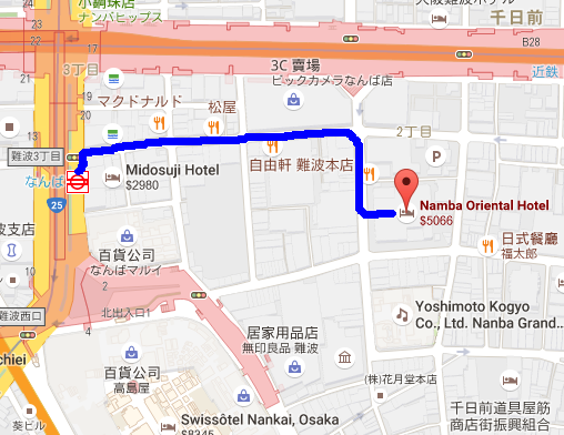 第一天下午趁check in後的時間, 旺仔仔就起用"大阪周遊券"去梅田玩, 從東方飯店出來沿著商店街走, 沿著藍線走不用過馬路, 不用曬到太陽, 就可以到御堂筋線難波站入口
