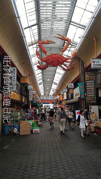黑門巿場跟一般商店街差不多, 都有很高的天花板可以遮雨擋太陽, 可以很方便的逛逛, 還有黑門巿場在天花板會吊掛各種海鮮, 這裡是一隻螃蟹