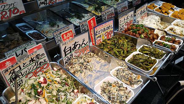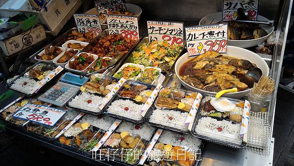 店門口排滿了各式各樣的熟食小菜, 價格也還好, 如果住在日本每餐買幾個熟菜來配白飯也很便宜, 不過旺仔仔只來玩兩三天就沒有什麼用處
