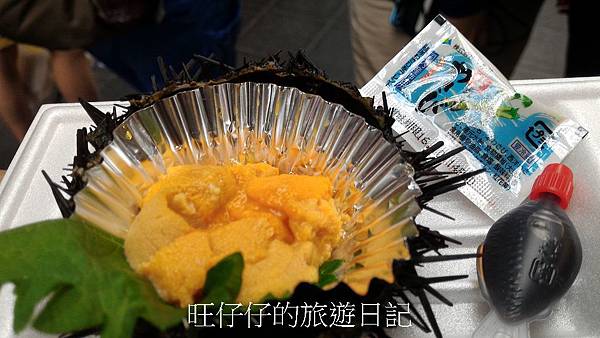 這就是旺仔爸買的海膽, 有附芥茉和醬油, 一定要加不然會有很"新鮮"的味道, 旺仔爸說超好吃, 還有海水的味道