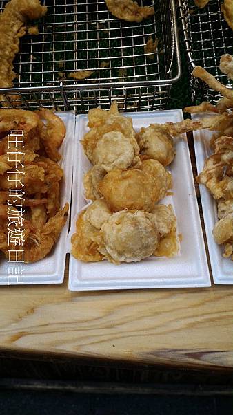 門口的台子上放滿了各種炸物, 看得旺仔仔都很想吃, 價位從100~500都有