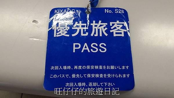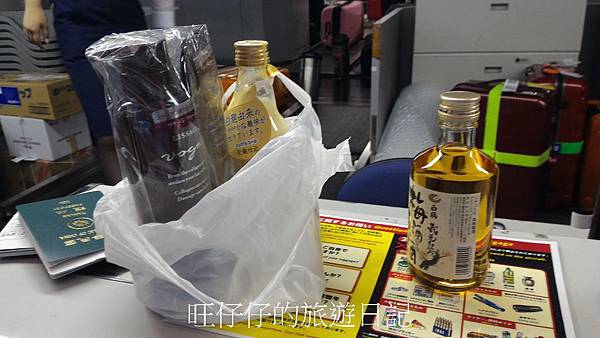 過海關檢查的時候, 發生一件很有趣的事(姐姐說的, 發生在別人身上很有趣, 自己不要遇到比較好), 旺仔姨早上買的酒放在隨身包包沒有托運, 被海關攔下來, 一般來說就直接丟掉或沒收, 但是關西機場的海關人員很好, 讓我們有補救的方法