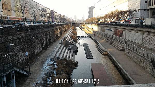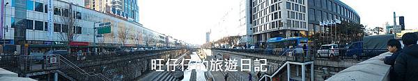 清溪川兩旁都是巿場, 這裡人跟車子都超多的, 這個是旺仔爸在五間水橋上用全景拍的, 右邊是東大門綜合巿場, 左邊是平和巿場
