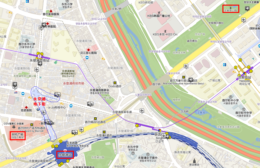 地圖上從右上角是汝矣島文化公園, 到左下角藍色區域是永登浦地下街, 地鐵可以坐到永登浦站從3號出口直接進入地下街, 旁邊也可以連接時代廣場